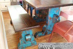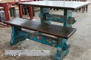 Custom Table 52"Lx42" with 2" end caps. Bench 5ftL with 2" end caps. Finished in Kona top and Kona/Lafonda Turquoise paint (worn)