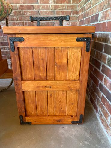 4ftL x 30"W x 28"T pictured finished in weathered gray stain and white(worn) bands.